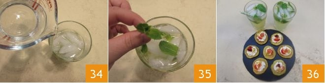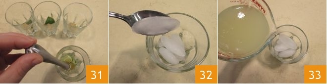 Continue like this for the other glasses 31, then add ice 32 and pour lemonade 33