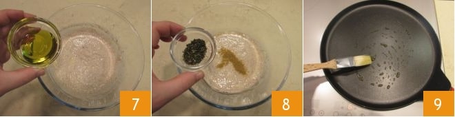 Then add 2 tablespoons (1 oz) of oil 7, the chopped herbs, and turmeric 8. The batter for the whole wheat pancakes is ready. You can use it immediately or let it rest in the fridge for a while. Heat a non-stick pan and brush it with 1 tablespoon (0.5 oz) of oil using a kitchen brush 9.