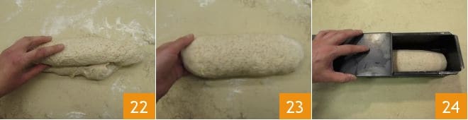 and work it briefly with your hands to roll it up without flattening it 22, forming a loaf of the same length as the pan 23. Place the loaf in the pan 24, close it with the lid, and let it rise in the oven turned off with the light on for about 2 hours.