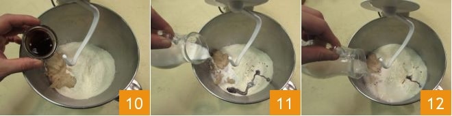 the malt (you can alternatively use honey) 10, the lukewarm milk 11, and the yeast previously dissolved in water 12.