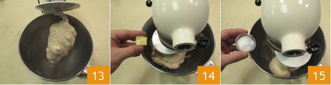 Start the stand mixer on low speed to mix all ingredients well until you have a smooth and homogeneous mixture 13. At this point, add a piece of butter at a time, keeping the mixer running and ensuring that it is completely absorbed before adding the next 14. Finally, add the salt 15