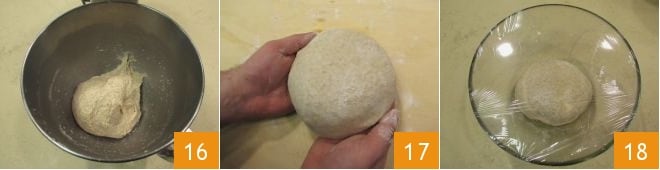 and continue mixing until the dough almost completely detaches from the sides of the bowl 16. Turn the dough out onto a lightly floured work surface and work it quickly to shape it into a ball 17, then place it in a bowl, cover with plastic wrap 18, and let it rise at room temperature for about 1.5 hours.
