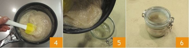 After about 5 minutes, the mixture will have reached a gelatinous consistency with an opalescent appearance 4, so remove the saucepan from the heat and transfer the mixture into an airtight jar 5. Allow the water roux to cool, covered with the lid or with plastic wrap in contact 6, then take a portion weighing 4.2 oz that you will use to make the rest of the recipe.