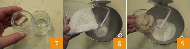 Pour the fresh yeast into room temperature water 7 and stir to dissolve it completely. In a stand mixer fitted with a dough hook, pour in the whole wheat flour and bread flour 8, the 4.2 oz of water roux prepared earlier 9,