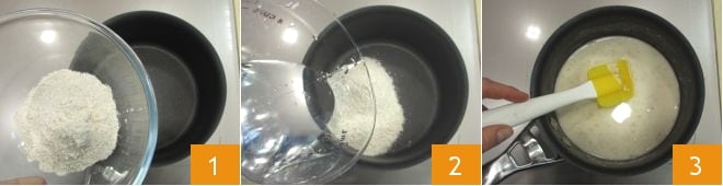 To make whole wheat sandwich bread, first prepare the whole wheat water roux: pour the whole wheat flour into a saucepan 1, add room temperature water 2, and stir gently over low heat with a whisk or spatula, being very careful to avoid lumps 3.
