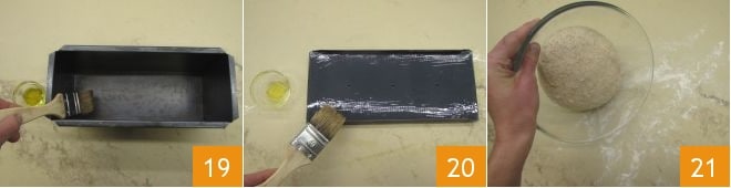 After the rising time, oil a 9.8 x 3.9 x 3.9 inch loaf pan 19 and its lid well 20. Turn the risen dough out onto a lightly floured work surface 21