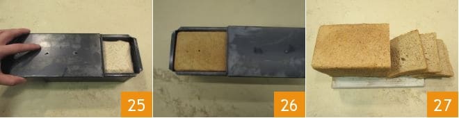 When the dough has reached the edge of the pan 25, bake in a preheated static oven at 374°F for about 40 minutes with the lid closed. The bread will be ready when it reaches a core temperature of 205°F, measured with a probe. Once baked, remove the pan from the oven and let it cool without the lid 26, after which your whole wheat sandwich bread will be ready to be sliced and enjoyed as you prefer 27!