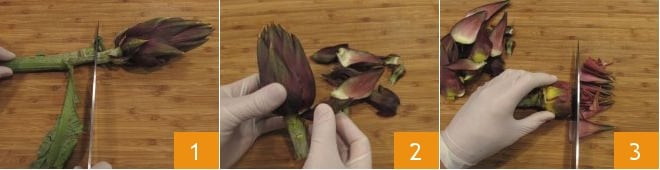To make whole wheat spaghetti with artichokes and breadcrumbs, start with the How to clean artichokes: rub your hands with lemon to prevent the substances inside this vegetable from blackening your hands; alternatively, you can wear gloves. Remove the end of the stem 1, remove the outer and tougher leaves 2, and with a paring knife, remove the fibrous outer layer of the stem. Cut off the tip 3