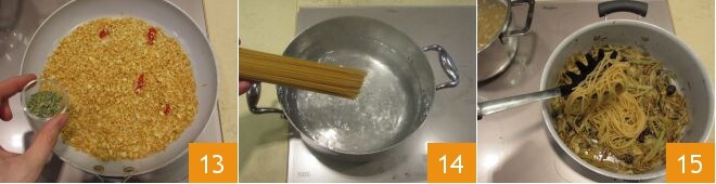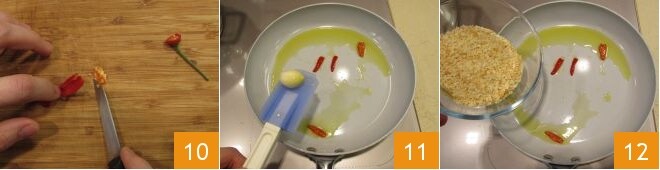 Meanwhile, remove the stem from the chili pepper and extract the seeds 10, then slice it into strips, heat the other 1 tbsp of olive oil in a pan with the garlic and chili pepper 11, add the chopped breadcrumbs 12 and toast and flavor them for 5 minutes; the cooking time depends on how coarse the breadcrumbs are, the coarser they are, the longer the toasting time.