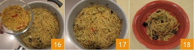then add the toasted breadcrumbs 16, stir for a moment to flavor 17, and then serve the whole wheat spaghetti with artichokes and breadcrumbs piping hot 18.
