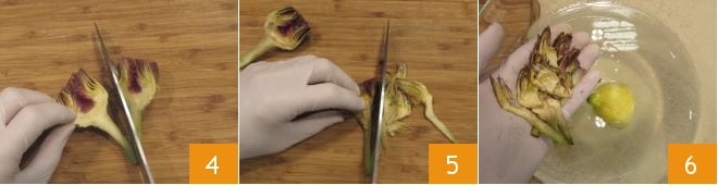 cut the artichokes in half 4, then slice them into thin strips 5 and place them in a bowl filled with water acidulated with lemon to prevent them from blackening 6.