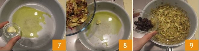 In a pan, heat 1 tbsp of olive oil with the garlic clove 7, then add the sliced artichokes 8 and sauté over medium heat for 4-5 minutes, season with salt and pepper, then add the pitted olives 9 and continue for a few more minutes; the artichokes should remain slightly crunchy. When cooking is complete, remove the garlic. Meanwhile, bring a pot of salted water to a boil for cooking the pasta.