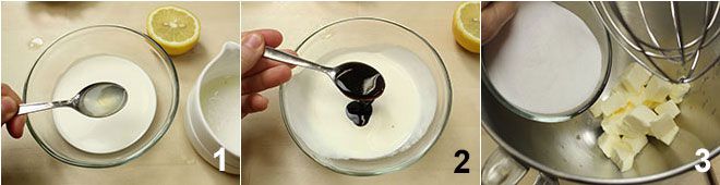 To prepare the whoopies, start by adding a teaspoon of lemon juice to the fresh liquid cream 1 (if you have buttermilk, go directly to step 2). Add the vanilla extract to the mixture 2 and stir. Beat the room temperature butter together with the sugar 3 using a mixer (or a stand mixer) until you get a light and fluffy mixture.