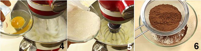While still beating, add the room temperature egg 4, the salt, and the cream and lemon mixture (or buttermilk) with the vanilla 5. In a separate bowl, sift the flour and cocoa 6,