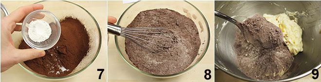 add the baking powder 7 and mix all the dry ingredients with a whisk 8. Now gently incorporate them into the butter, sugar, and egg mixture 9,