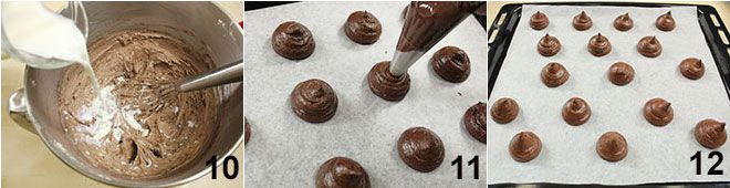 alternating with the room temperature milk 10. You should get a rather dense mixture which you'll place in a pastry bag with a smooth nozzle about 3/4 inch in diameter. Squeeze mounds of about 1 1/2 inches in diameter 11 onto a baking tray lined with parchment paper (you should get rather tall semi-spheres) for a total of about 16 mounds per tray 12. Bake in a preheated static oven at 350°F for about 13-14 minutes, then remove the whoopies from the oven and transfer them to a wire rack using a steel spatula. Let the whoopies cool.