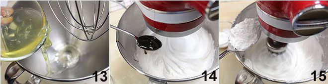 In the meantime, prepare the marshmallow cream by dissolving the granulated sugar in water in a small saucepan; when the syrup comes to a boil, let it cook over medium heat for at least 5 minutes. Meanwhile, in a large bowl, beat the egg whites with a pinch of salt 13 until stiff peaks form, and when the 5 minutes have passed, add the hot sugar syrup in a thin stream while continuing to beat. Continue until the mixture is lukewarm. Then incorporate the vanilla 14 and the powdered sugar 15.