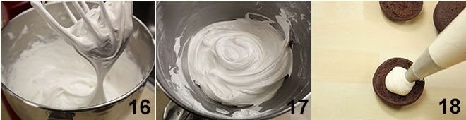 The whoopie cream should be dense, smooth, and glossy (16-17). Transfer it to a pastry bag with a smooth nozzle and squeeze the cream onto the flat side of a cookie 18 and cover with the flat side of another cookie. Continue in this way until all the ingredients are used up.