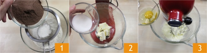 To prepare Nesquik whoopies with stracciatella cream, first prepare the cakes: mix the Nesquik and sifted flour, baking powder, and a pinch of salt 1 in a bowl and set aside. In the bowl of a stand mixer fitted with beaters, or alternatively, you can use an electric mixer, place the butter which should be at room temperature and the sugar 2, beat for a few minutes then add the egg 3,