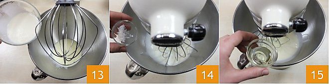 and let the beaters run for 5 minutes 16. Then transfer the cream to a small bowl and cover it with plastic wrap 17 and let it cool in the refrigerator for 5 minutes until it reaches the same temperature as the cream that you will whip later. This step is crucial to avoid creating lumps in the cream. Take the cold cream and whip it 18 with a stand mixer fitted with beaters, or with an electric mixer