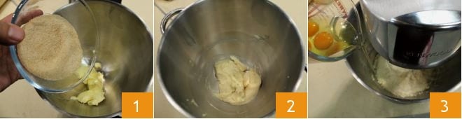 Sift the flour together with the baking powder 4 and add it to the mixture little by little 5; keep the mixer going, in the meantime finely chop the dark chocolate with a knife 6