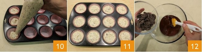 Place 12 paper cups in a muffin tin and with the pastry bag fill each cup to ¾ with the batter 10. When you have finished 11, bake in a static oven preheated to 340°F (or 300°F for 20-25 minutes if using a convection oven) for 25-30 minutes. Meanwhile, you can prepare the witches' hats: first, place an aluminum baking sheet in the freezer (you will need it later); then melt about 4.5 oz of chocolate in the microwave for 2 minutes at maximum power 12 (you can also melt the chocolate in a bain-marie); finely chop the remaining chocolate and set aside.