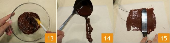 Stir with a spatula every 40/50 seconds 13 and once it has melted, add the chopped chocolate, continuing to stir until it is completely melted (if necessary, place it in the microwave for a few more seconds). At this point, pour 2/3 of the melted chocolate onto a sheet of parchment paper 14 and spread it with a spatula to a thickness of 1/8 inch 15. Keep the remaining melted chocolate because you will need it later to cover and assemble the hats.