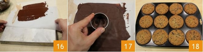 Transfer the parchment paper sheet onto the bottom of the inverted baking sheet that you previously cooled in the freezer 16: when the chocolate has slightly set, use a 2.2-inch-diameter pastry cutter to make 12 disks and then place them in the refrigerator to set for at least 30 minutes 17. Meanwhile, check the muffins' doneness by doing the toothpick test: insert the toothpick into the center of the muffin and if it comes out clean, it means they are ready 18; otherwise, extend the baking time by a few minutes. Then take them out of the oven and let them cool completely.