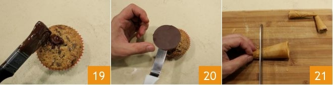 When the muffins have cooled, place a small amount of the reserved melted chocolate in the center of each muffin to ensure the base of the hat adheres well 19; then place the chocolate disk you made earlier: it will be the brim of the hat 20. If, during the hat-making process, the melted chocolate tends to solidify, melt it again in the microwave for a few seconds. With a knife, cut the tips off the wafer cones: these will be used to make the top part of the hats 21;