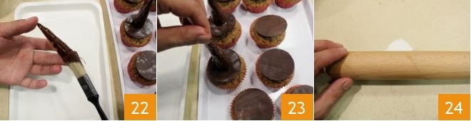 Brush the entire surface of the tips well with the melted chocolate, covering them evenly 22. With the remaining melted chocolate, attach the covered wafers to the disks you placed earlier on the muffins 23. Finish the witches with hats by making the eyes: roll out the sugar paste with a rolling pin to a thickness of 3/16 inch 24;