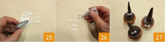 With the help of a plain tip of a pastry bag, make 25 discs measuring 1/4 inch 25 and with a paper cone filled with the remaining melted chocolate, create the pupils by placing a dot of chocolate on each disc 26. Once ready, attach the eyes by placing a dot of melted chocolate: you can decide whether to place them directly on the hats or on the muffins just below the brim. Let the chocolate cool for 30 minutes at room temperature and finally, you can serve and enjoy your witches with hats 27!