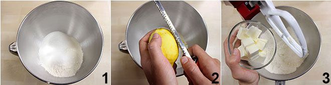 To prepare the witch's pumpkin cookies, start by preparing the shortcrust pastry: put the flour 1, sugar, grated lemon zest 2, and a pinch of salt in the bowl of a stand mixer. Mix the ingredients and then add the cold butter in pieces 3 and
