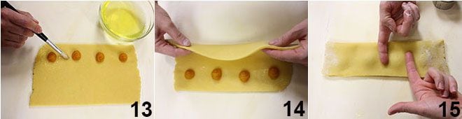 Brush around the filling dollops with the egg white 13 to help the pastry stick and fold the pastry over the other half 14. Press between the spaces to adhere everything well 15.