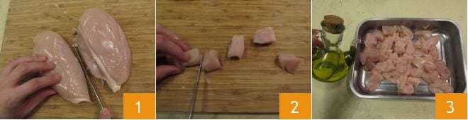 To make the yakitori rolls, first prepare the chicken: cut the chicken breast in half 1, remove any remaining fat and cartilage, and cut it into cubes no larger than 3/4 inch 2. Transfer the chicken to a baking dish and season with oil 3,