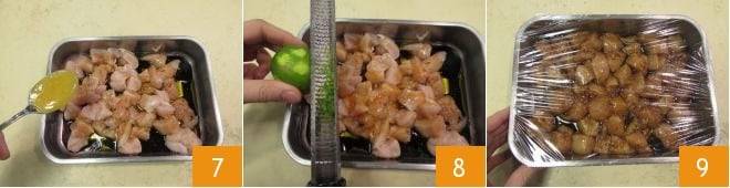 honey 7 and lime zest 8, mix well and cover with plastic wrap 9. Marinate the chicken in the refrigerator for at least an hour or, better yet, overnight.