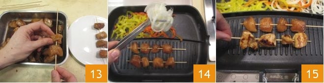 After the marinating time, take the chicken cubes and skewer them on a wooden stick 13. Heat a grill well and cook both the meat skewers and the vegetables 14; if you don't have a grill with two compartments, we recommend grilling the vegetables first and then the meat. Cook the skewers for about 4-5 minutes, turning them often to ensure even cooking 15. Once ready, transfer the skewers and vegetables to a baking dish and cover with plastic wrap to keep them soft.