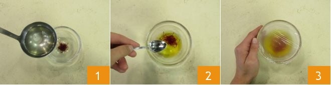 To prepare the yellow rice croquettes with stracchino, start by infusing the saffron. Place the threads in a small bowl and cover them with a bit of hot Vegetable broth 1: the same broth you will use to cook the risotto. Then stir 2 and cover with plastic wrap. This way, the threads will release their color and aroma 3.