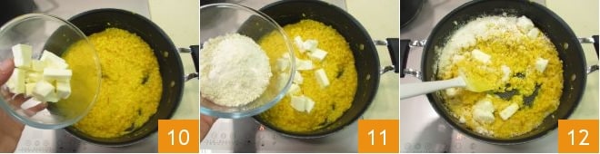 Add the butter 10 and grated cheese 11 and stir 12.