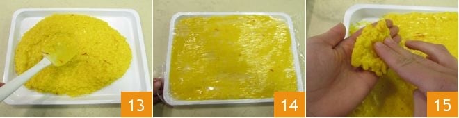 Transfer the mixture to a tray 13 and spread it evenly. Cover with plastic wrap and let it cool in the fridge for at least 30 minutes 14. When the rice is well compacted and cold, take it out and take pieces of about 1 oz each 15.