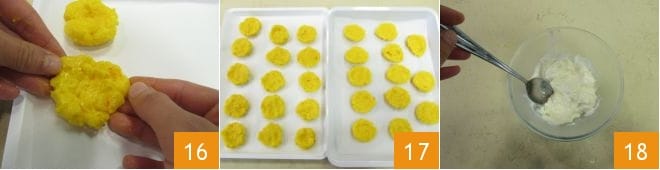 Make a small hollow in the middle and place on a tray with parchment paper 16. Continue this way until you have about 30 pieces 17. In a bowl, work the stracchino with a spoon 18.