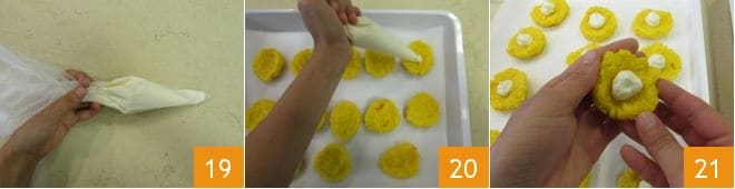 Then transfer it to a piping bag 19. Start squeezing some stracchino into the center of the hollows 20, and when you're done, proceed to close them. Join the ends 21.