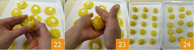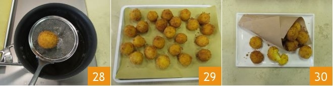 As soon as they are golden 28, drain the croquettes directly on absorbent paper and continue cooking all the others 29. Here are your yellow rice and stracchino croquettes ready, salted on the surface and bon appétit 30!