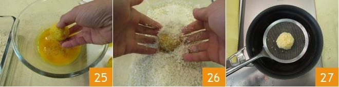 Dip one ball at a time first in the beaten eggs 25 and then in the panko 26, and when they are all ready, cook them. Immerse a few pieces at a time in deep hot oil at 284°F (check the temperature with a kitchen thermometer) 27.