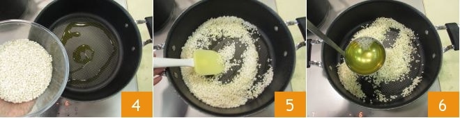 In a saucepan, heat a drizzle of oil, and when the base is hot, add the rice grains 4. Toast well for a couple of minutes, stirring continuously 5. It's time to start cooking. Wet the rice with the hot broth, adding a ladle whenever it's about to dry; stir occasionally 6.