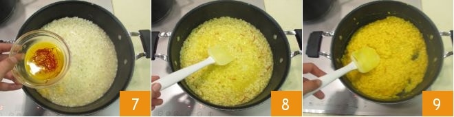 Season with salt and halfway through cooking, add the saffron infusion 7 and mix well 8. Continue cooking, and when it reaches the end, turn off the heat 9.
