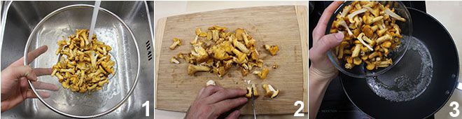 To prepare yellow risotto with chanterelles, wash the mushrooms under running water 1, dry them with a cloth, and halve the larger ones 2. Stew the chanterelles in a pan with 3 tablespoons of butter 3 for a few minutes and lightly salt them.