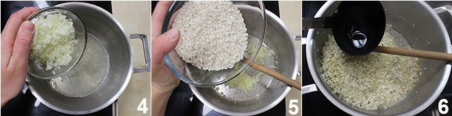 In a large pot, melt the remaining 3 tablespoons of butter and sauté the finely chopped onion until golden 4. Add the rice and toast it for a few minutes, stirring to prevent sticking 5. During cooking, deglaze the rice with broth, adding a ladleful from time to time 6.
