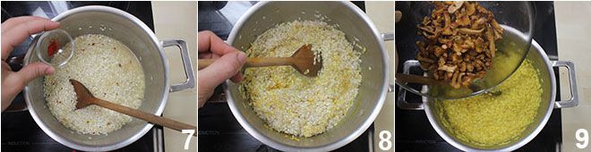 After 10 minutes, add the saffron 7 and continue cooking by adding more broth and stirring 8. When almost done, add the cooked mushrooms 9 and adjust the salt if necessary. Finish with a sprinkle of pepper and, with the heat off, add the grated parmesan and stir until creamy. Serve the yellow risotto with chanterelles hot.