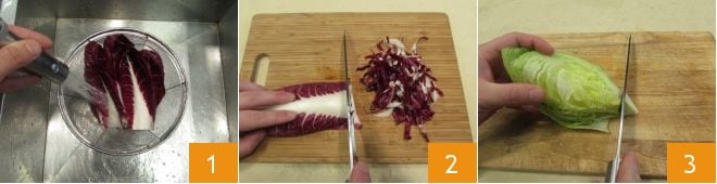 To prepare the yogurt salad with salmon and shrimp, start by washing all the vegetables and drying them with a cloth. Start with the radicchio 1. Then cut it into thin strips 2. Place it in a small bowl and set aside. Then move on to the lettuce: cut the head of lettuce in half and remove the tougher inner part 3.