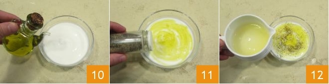 Then dedicate yourself to preparing the yogurt sauce. In a small bowl, pour the fresh yogurt and add the oil 10. Adjust with salt and pepper 11. Also, add the lemon juice 12.